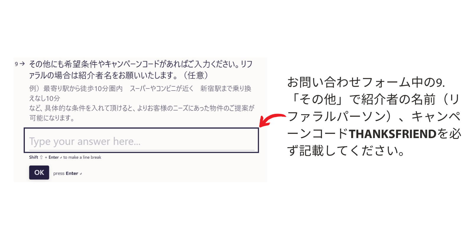 申し込み時に、お問い合わせフォーム中の9.「その他」で紹介者の名前(リファラルパーソン)、キャンペーンコード【THANKSFRIEND】を必ず記載してください。