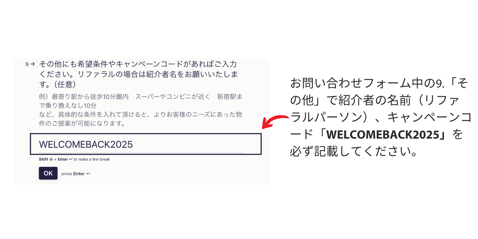 申し込み時に、お問い合わせフォーム中の9.「その他」で、キャンペーンコード[WELCOMEBACK2025]を必ず記載してください。